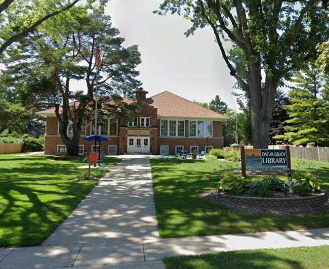 Oscar Johann Grady (1885-1964) left $5,000 to the Village of Saukville for a library when he passed away. Oscar was one of five brothers, two of whom ran a grocery store. He was regarded by many as reclusive, even a hermit, living alone in the woods along the Milwaukee River north of Newburg. It was said that he communed with the wild animals, built bird houses and mounted them on all the fence posts at River’s Edge and built several buildings of stone as well as an amphitheater. That wilderness near Newburg became the foundation for the Riveredge Nature Center. On the night of Nov. 15, 1964, as he was walking home from Saukville along Highway 33, Oscar Grady was struck by a car and killed. In 1972, the grand opening for the Oscar Grady Library was held on October 15th at 333 West Church Street. Chelene C. Golownia was appointed as the first librarian. The library was not funded by the Village of Saukville budget, but Chelene and many volunteers kept the library open. Fifteen years later it moved to its current location, the former Saukville Elementary School and American Legion Hall. In 1997, a new addition was built which doubled the size of the library. That’s the door I photographed.